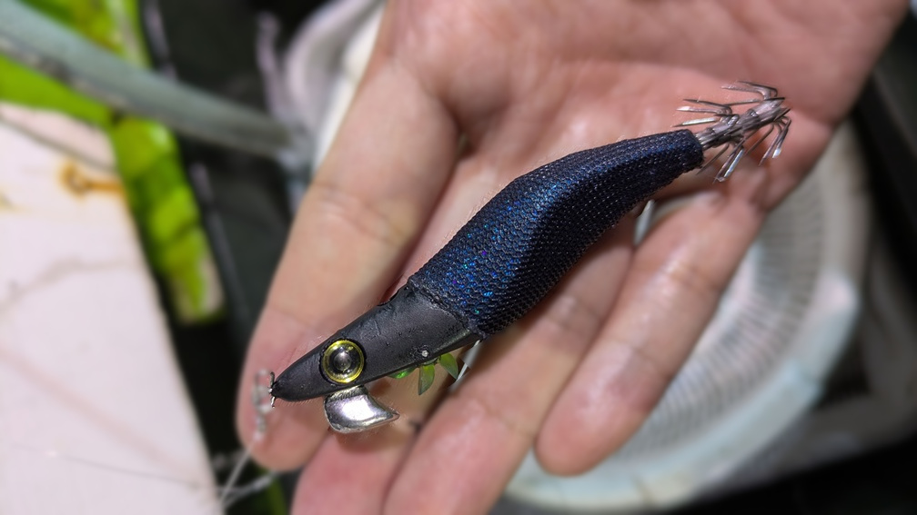 この激渋の日にも関わらず、明らかな差が出ました。リグに複数のエギを付けて試したところ、イカはこの「エビさんエギ」ばかりを選んで抱いてきたのです。